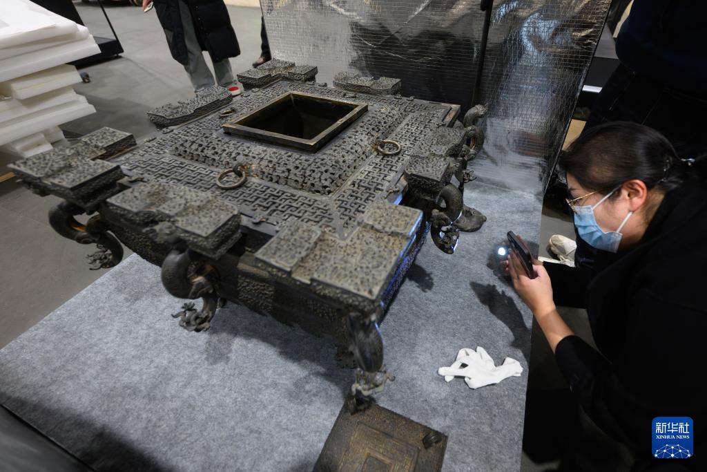 在湖北省博物館,任務人員在對文物銅鑒共享空間缶進行點交(3月4日教學攝)。